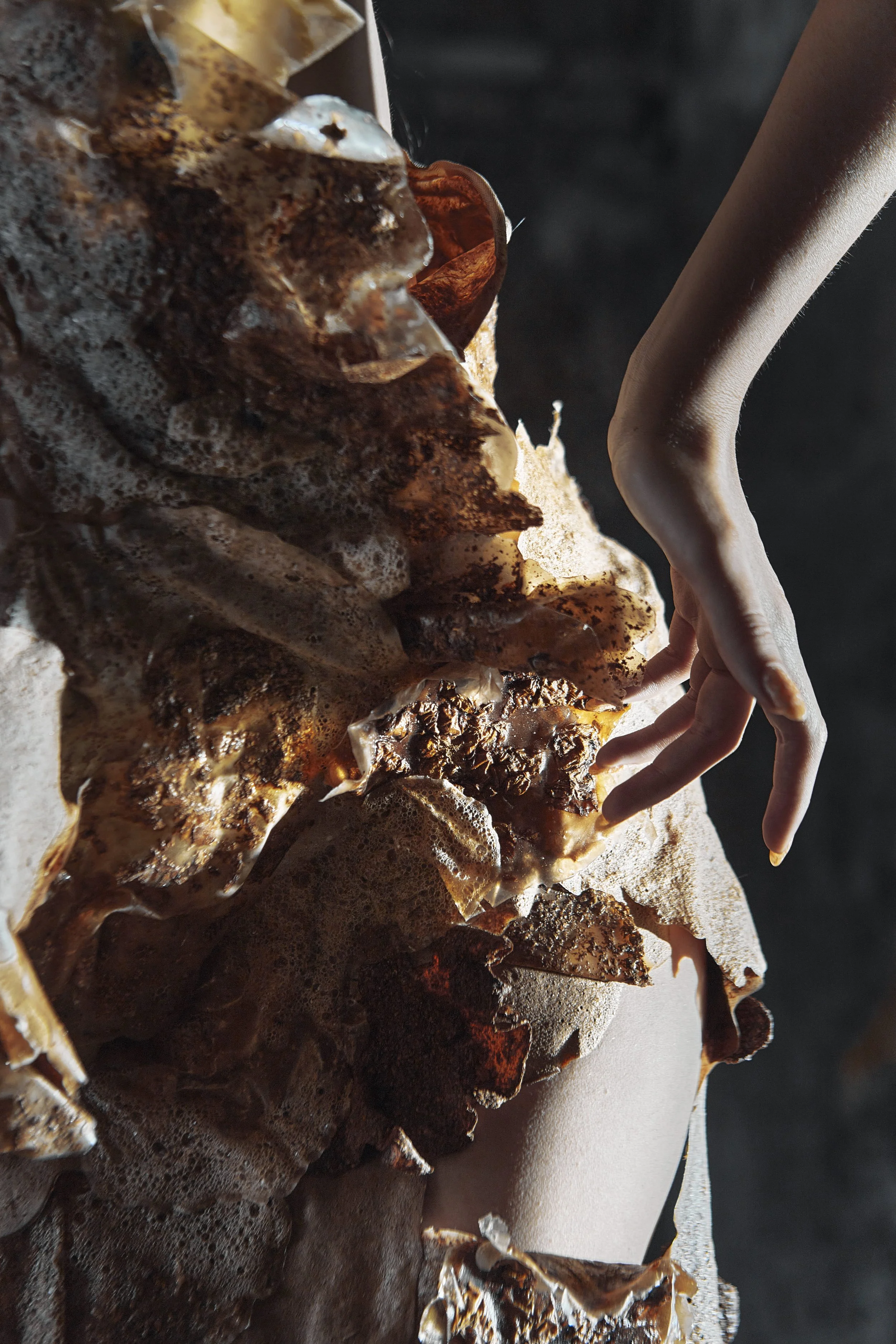Garment created with natural latex, broken plaster pieces from molds, dried flower petals.